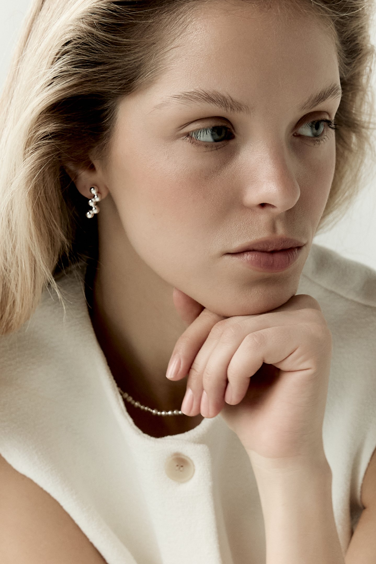 Kolczyki monolityczne na sztyfcie odlane ze srebra próby 925 nawiązują do charakterystycznego dla serii Genes szyku kulek inspirowanego krzaczkiem porzeczki. Długość całkowita 20mm.